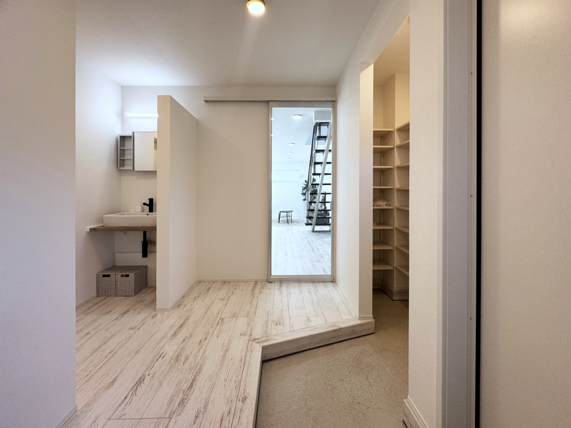 階段を上がった先に広がるのは、廊下でもなく個室でもない、自由度の高いフリースペースです。