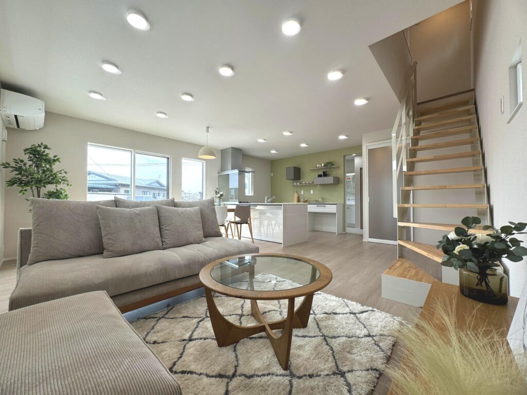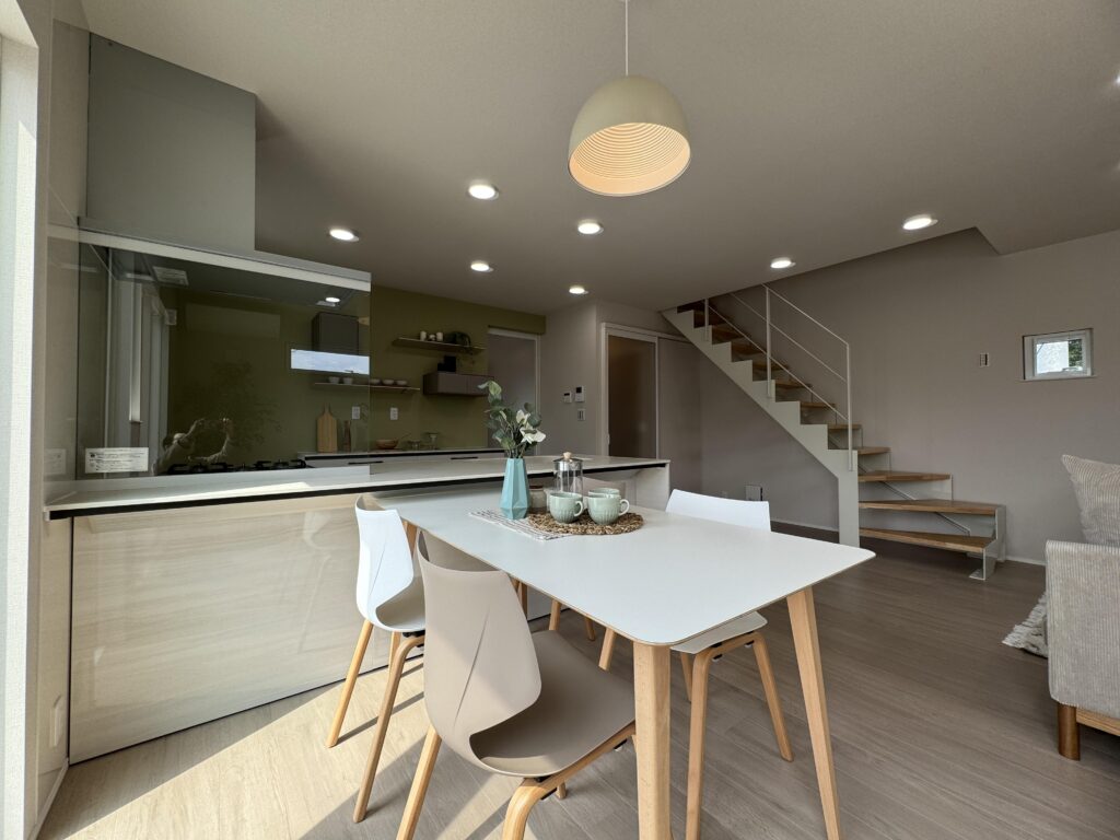 また、デザイン性の高いリビング階段は、空間に広がりと採光をもたらし、家族のコミュニケーションを自然と深めます。美しさと機能性が融合したLDKです。