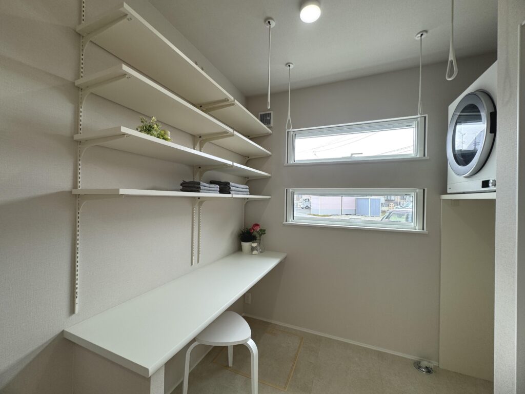 洗濯物の「洗う→乾かす→畳む→しまう」までを全て一箇所で完結させるワンストップ動線が魅力。パワフルな乾太くんは短時間で衣類をふっくら乾燥させ、天候や花粉を気にしません。広々としたロングカウンターは、アイロンがけや畳み、仕分け作業に最適。日々の家事ストレスから解放され、時間的なゆとりを生み出します。!